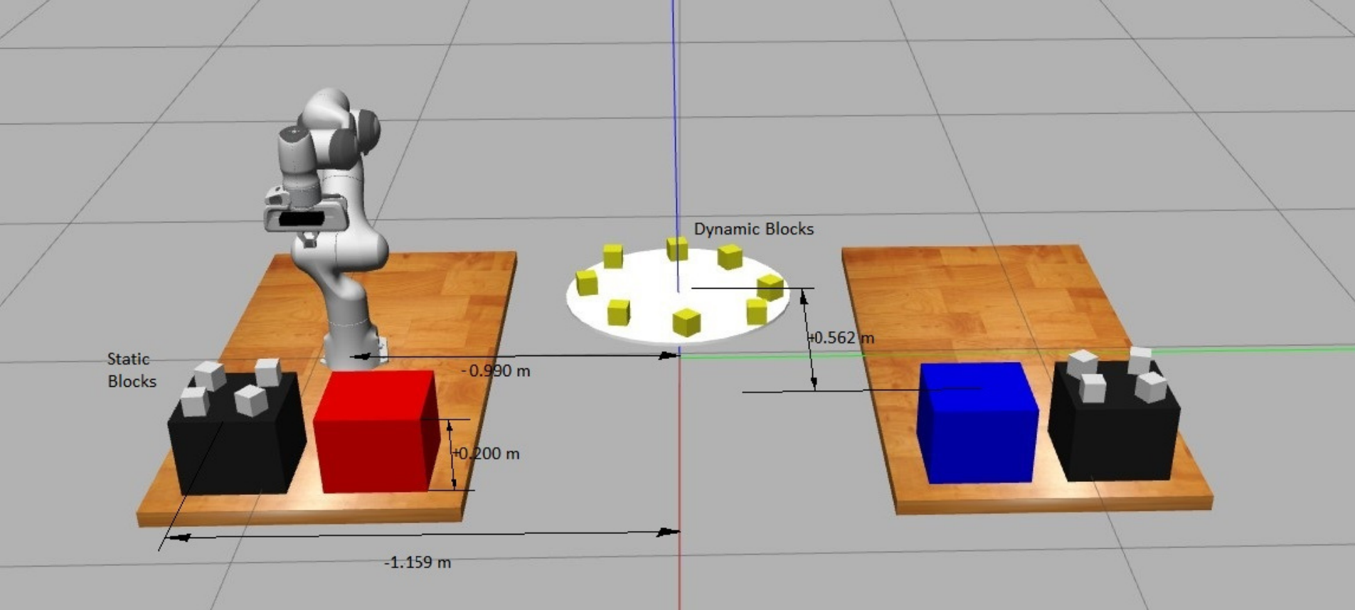 The goal of this project is to use Franka Emika PANDA to pick up objects in the following environment and place them where they need to go. The task is to develop a robust and reliable solution which can acquire blocks (either stationary or in motion) and stack them on a goal platform, in as tall a tower as possible.